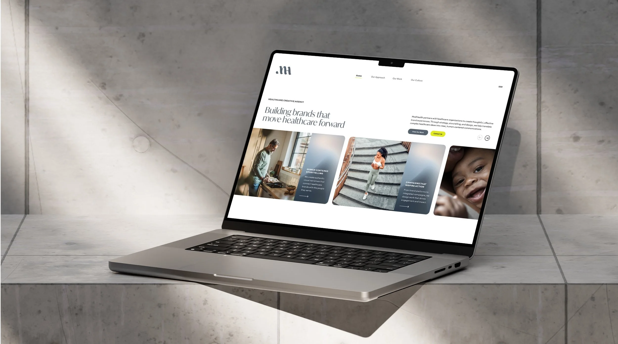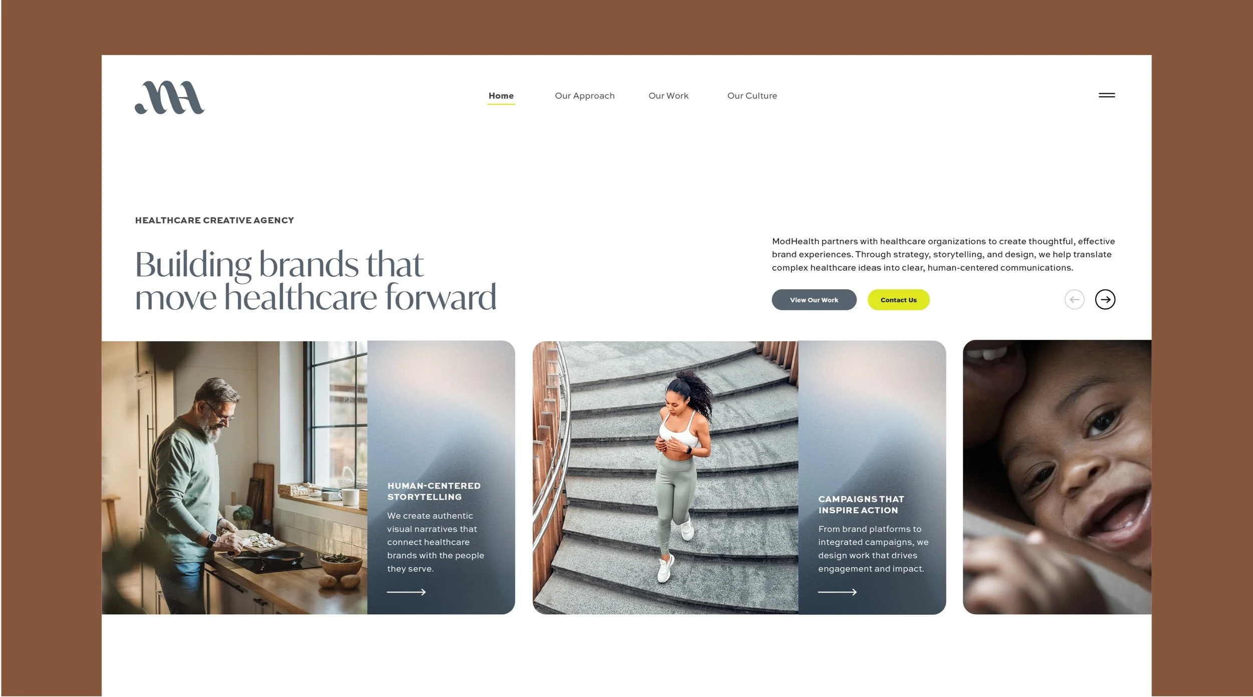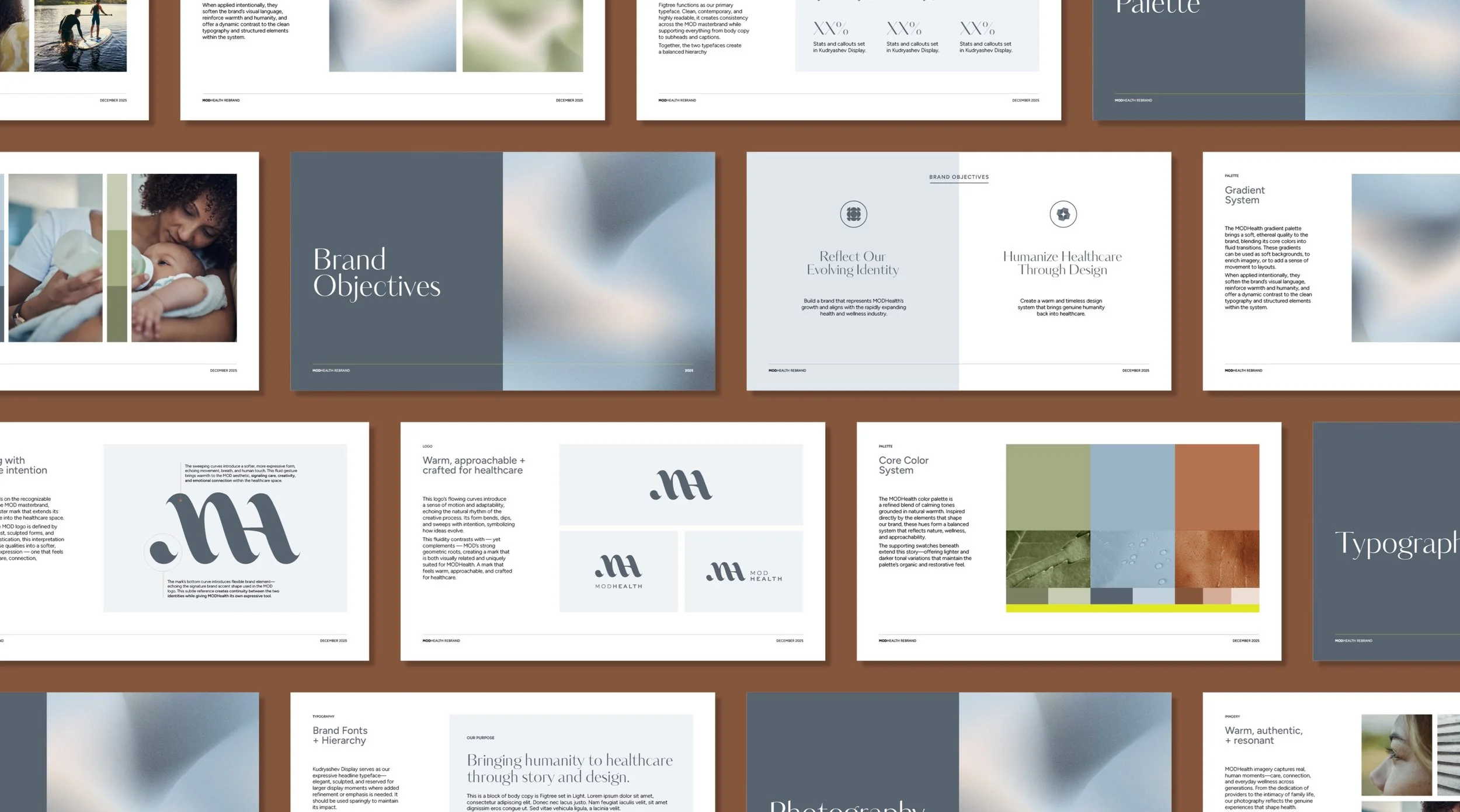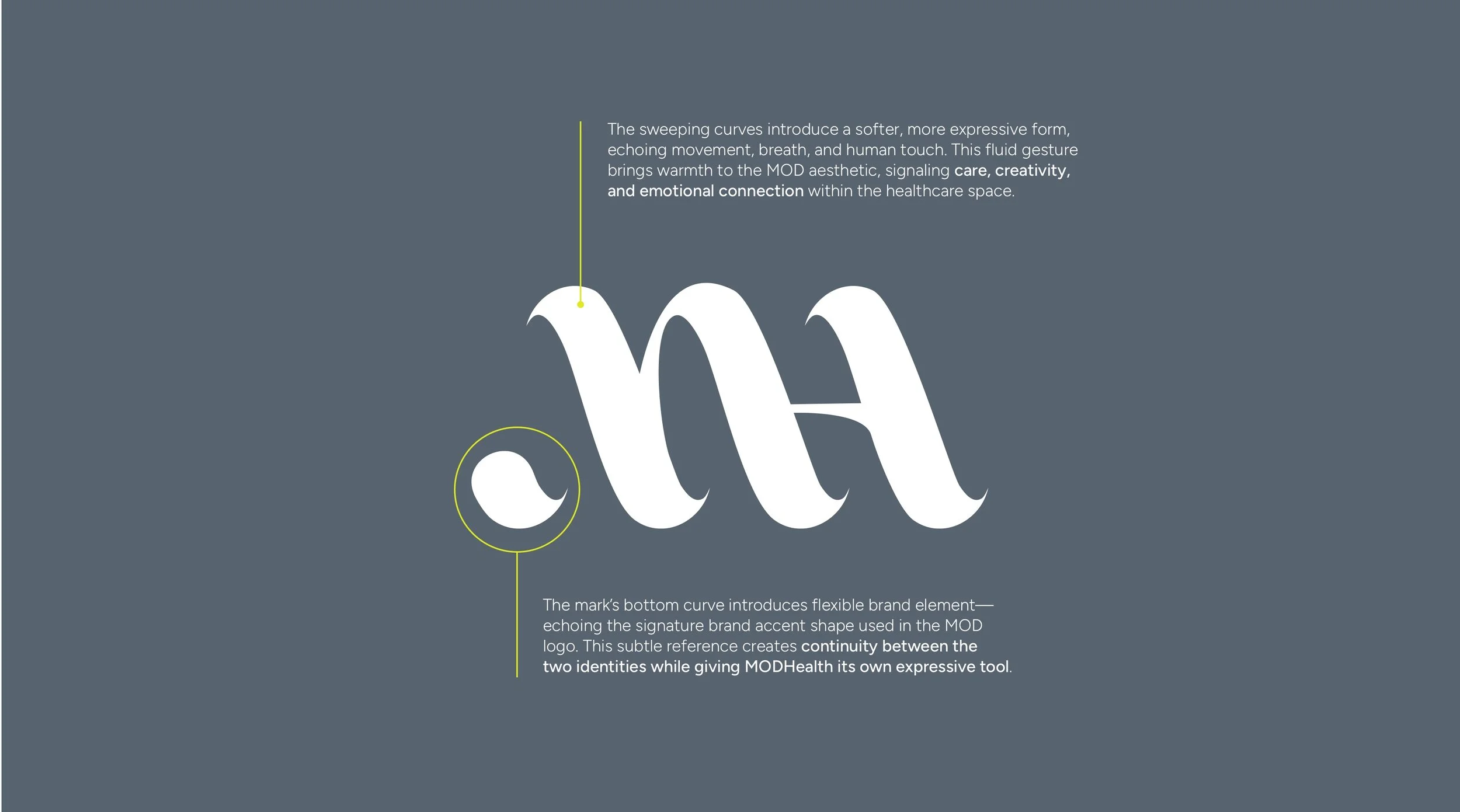 An exploratory brand direction for MODHealth that introduces a softer, more expressive visual language. The concept uses fluid forms and human-centered design elements to bring warmth and movement to the healthcare-focused brand while maintaining a clear connection to the MOD parent identity.